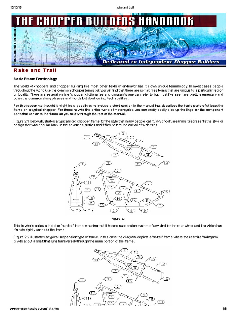 FORK GEOMETRY AND MEASUREMENT from trikerdon.50megs.com This is the bible on the subject. Understanding trail is a little less easy. Rake the rake is the angle formed between the neck on the frame of a bike and a vertical line. When looking at motorcycle specifications, the terms rake and trail often are listed. Rake and trail play a large role in a motorcycle's handling. Hence the spec sheet figures provide an insight to how the motorcycle will handle. How do they affect one another? Chopper builders need to consider how the various parts are going to fit together, whether they'll need to offset.